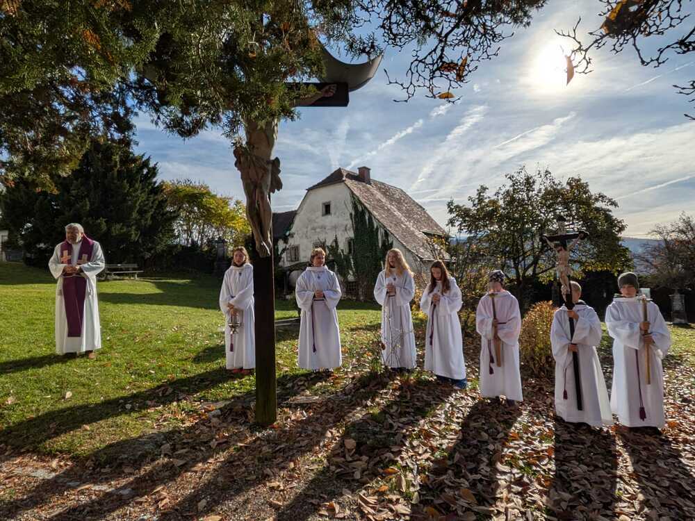 Anschließend begleiteten die Ministranten den Priester bei strahlendem Sonnenschein am Friedhof in Peggau bei der Gräbersegnung, zu der viele Angehörige gekommen waren.
