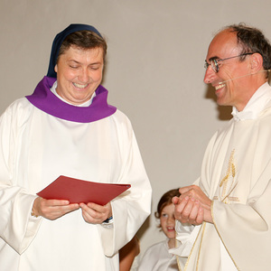 Und auch Sr. Maria beginnt einen neuen Dienst: Sie wurde nach einer Ausbildung vom Bischof als Begräbnisleiterin in die Pfarre gesendet und bekam von Pfarrer Hans Karner das Dekret dafür im heutigen Gottesdienst überreicht. Dabei trug sie eine weiße Albe mit einem violetten Kragen, wie es für Begräbnisleiterinnen vorgesehen ist.
