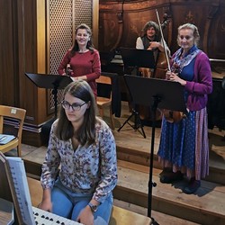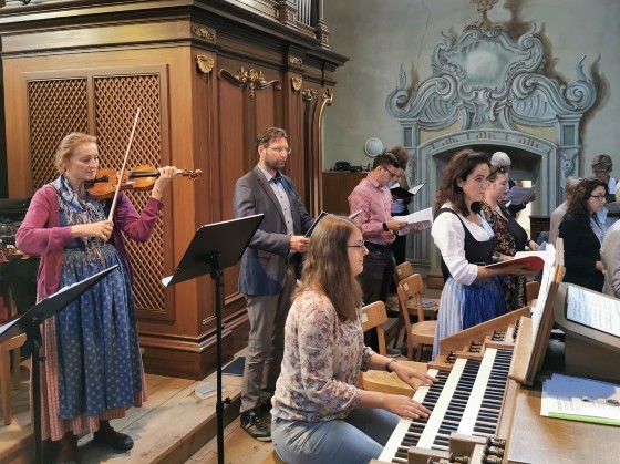 Wir konnten die „Missa in B“ (KV 275) von Wolfgang Amadeus Mozart wie geplant zur Aufführung bringen, allerdings in stark verkleinerter Besetzung: ungefähr der halbe Chor musizierte zusammen mit dem Solistenquartett Birgitta Wetzl, Elisabeth Weber, Markus Sölkner und Ewald Nagl das schwungvolle Werk in Begleitung eines Streichtrios unseres Orchesters und mit Christina Eichberger an der Orgel. Die feiernde Gemeinde und wir Ausführende selbst hatten große Freude an den schon so lange vermissten feierlichen Klängen einer Chor-Orchester-Messe!