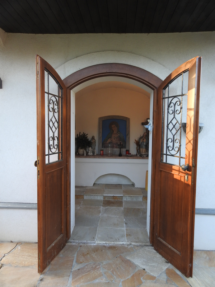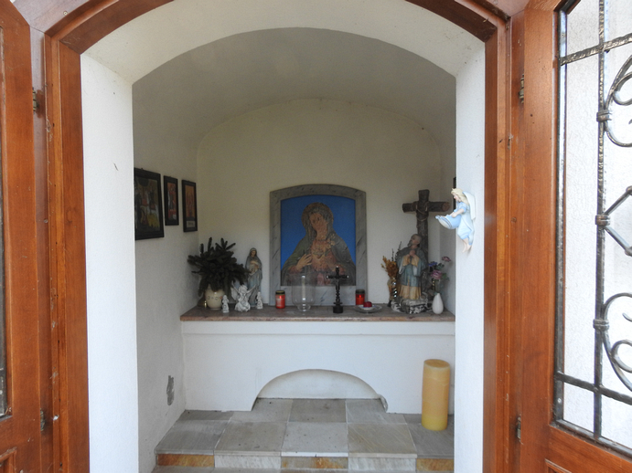Beschreibung: Die Kapelle hat einen offenen Glockenturm, in dem eine Glocke hängt, und auf dem Turm ein goldenes Kreuz. Eine doppelflügelige Holztür mit schmiedeeisenen Gittern vor den Sichtfenstern führt ins geräumige Innere. Zum Altar führt eine Stufe. Unter dem Altar ist eine Nische; die Fläche des Altars ist eine Mamorplatte. Zentral am Altar steht ein schon verschwommenes Bild von Maria mit offenem Herzen, davor ein Kruzifix, wobei das Kreuz aus dunklem Holz gedrechselt, der Korpus aus Metall ist. Es finden sich noch weitere persönliche Andenken der Familie am Altar und an den Wänden.