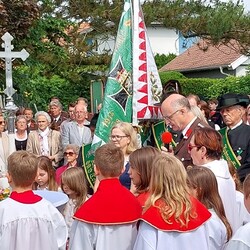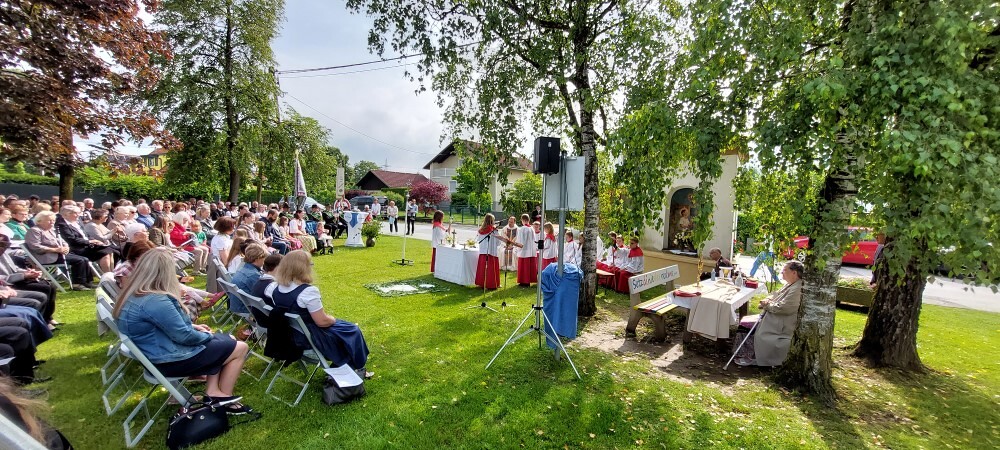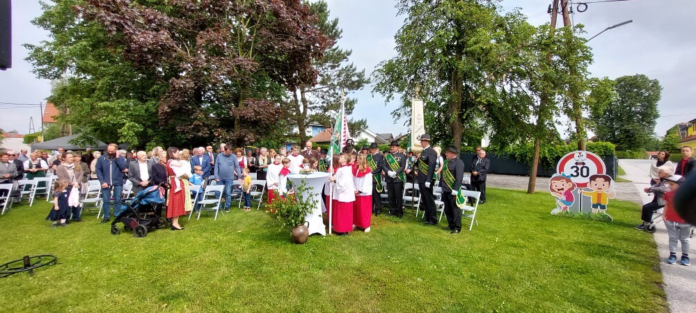 Im Anschluss an die Hl. Messe, zelebriert von Vikar Gerhard Hatzmann und begleitet von Kantorin, Lektoren und liturgischen Diensten beider Pfarren, fand eine Andacht bei den vier Stationen am Dorfplatz statt. Für die kleine Prozession waren vier Brottische als Altäre gerichtet, als Sinnbild für die vier Himmelsrichtungen und dafür, dass Christus der Heiland der ganzen Welt ist. Im gemeinsamen Liedruf "Brot des Lebens" zogen die liturgischen Dienste und die Kinder stellvertretend für das Volk Gottes zu den vier Altären: Brot der Liebe – Brot der Versöhnung – Brot des Friedens – Brot der Hoffnung. Zum Abschluss erteilte Vikar Hatzmann den Eucharistischen Segen, verbunden mit der Einladung, das Allerheiligste gemeinsam zur Kirche zu begleiten. Die Feier schloss mit dem gemeinsam gesungenen "Te Deum" ab. Zu den Feierlichkeiten waren auch die Vereine wie Feuerwehr und ÖKB eingeladen.