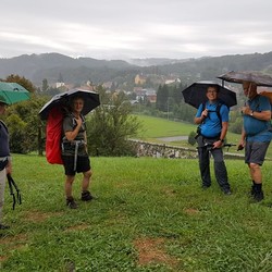 Am zweiten Tag führte uns der Weg - alle gut beschirmt (siehe Foto) - bei nassfeuchtem Wetter weiter nach Gamlitz. An der Ratscher Weinstraße überquerten wir die Staatsgrenze nach Sveti Kungota. Die Nächtigung erfolgte in Marburg.