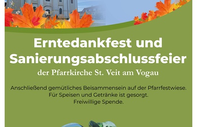 Erntedankfest und Sanierungsabschlussfeier 8. Oktober 2023, 09.00 Uhr Erntedankmesse anschl. herzliche Einladung zur Sanierungsabschlussfeier der Pfarrkirche St. Veit im Pfarrgarten! mehr: Erntedankfest und Sanierungsabschlussfeier