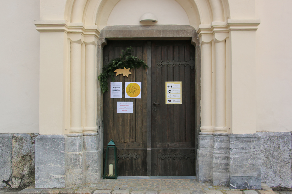 Beleuchteter Eingang der Pfarrkirche Dobl, Station zum Heiligen Nikolaus in der Pfarrkirche Tobelbad